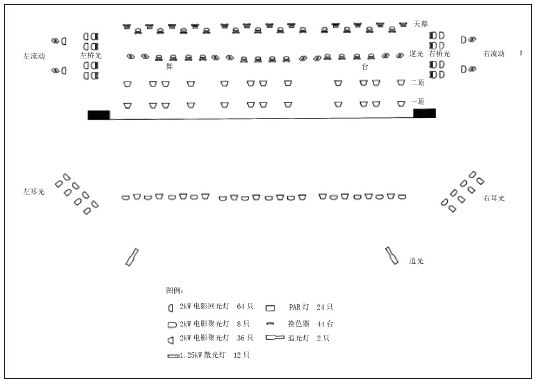 舞臺(tái)燈光平面布局圖如圖20所示。面光由24支2 000 W影視回光燈和聚光燈組成,光束自舞臺(tái)正前方的電動(dòng)吊架上以45°投向舞臺(tái)。耳光分別由4支回光燈和4支聚光燈組成,裝于臺(tái)口兩側(cè)交叉投向舞臺(tái),能增強(qiáng)舞臺(tái)道具、布景和人物的立體感。頂光設(shè)置由舞臺(tái)口向后延伸布置,選用24支2 000 W聚光燈,用于補(bǔ)充舞臺(tái)中、后部的藝術(shù)效果。逆光用24支2 000 W回光燈,布置在舞臺(tái)中后部,確保舞臺(tái)的立體效果。在天幕前舞臺(tái)上部吊桿設(shè)12支1 250 W天幕燈,俯射天幕,作背景及天空布景照明。
