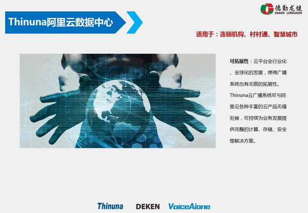 基于IP網(wǎng)絡(luò)通信協(xié)議和數(shù)字音頻技術(shù),依托阿里云數(shù)據(jù)中心,Thinuna(聲優(yōu)諾)云廣播面世。本系統(tǒng)解決了傳統(tǒng)廣播繁瑣的布線和傳輸距離近的問題,同時也解決了一般IP網(wǎng)絡(luò)廣播的大范圍布線的難題,更解決了地理環(huán)境限制問題。