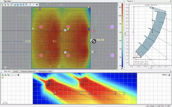 超低部分,為了滿足全場所有觀眾都能體驗到一致的低頻能量,我們在舞臺臺口設(shè)置了超低陣列,分別由15寸和21寸組成陣列,并且對每只超低音都加入相應(yīng)的延遲,來延伸低頻的能量向外擴展。