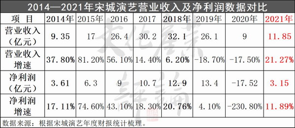 雖然數(shù)據(jù)向好,但已經(jīng)無法恢復至疫情前的水平。據(jù)文化產(chǎn)業(yè)評論梳理,對比宋城往年歷史數(shù)據(jù),2021年的營業(yè)收入和凈利潤僅相當于2014年的水平,凈利潤更是只有2018年的四分之一左右。反之,如果不是有2020年數(shù)據(jù)墊底的話,2021年的情況也相當難看,基本上回到了八年前。