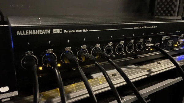 為了提升現(xiàn)場樂隊(duì)的返送信號(hào)的品質(zhì),提高工作效率,音響設(shè)計(jì)團(tuán)隊(duì)在系統(tǒng)中增加了ME-1個(gè)人監(jiān)聽系統(tǒng)。ME-1和Allen&Heath有一個(gè)原生的ME接口,通過這個(gè)接口,把信號(hào)連接到一個(gè)帶有PoE供電的ME-U HUB,然后將信號(hào)分配到每一個(gè)樂手的監(jiān)聽控制器ME-1。在這個(gè)監(jiān)聽控制器上,樂手可以選擇監(jiān)聽所需的特定信號(hào),或?qū)⑻囟ǖ臉菲靼醋约盒枰谋壤M(jìn)行調(diào)整,整個(gè)過程中不需要額外占用調(diào)音臺(tái)的輸出接口。