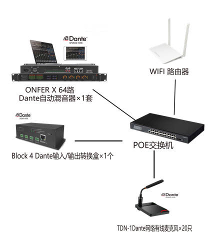力卡團(tuán)隊(duì)與客戶多次交流后,決定采用均支持Dante協(xié)議的Relacart CONFER X有線數(shù)字64通道自動(dòng)混音器與Block 4Dante 轉(zhuǎn)換盒和20只TDN-1Dante網(wǎng)絡(luò)有線麥克風(fēng)。