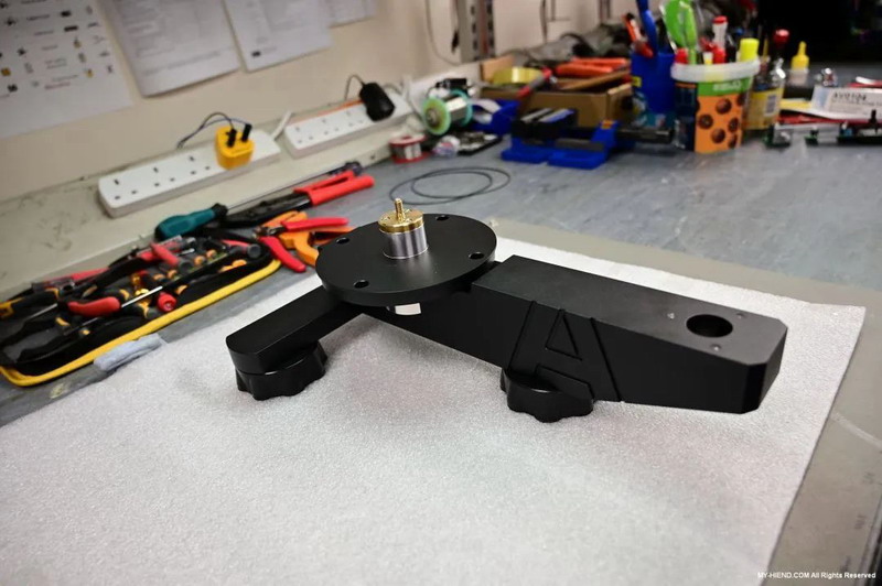 在這里也發(fā)現(xiàn)正在開發(fā)中的唱臂軌跡,桌上有許多唱臂的組成元件,我手上這個(gè)臂管是鈦合金,用于高階的唱臂,另外為了讓唱臂從唱頭蓋與軸心能精準(zhǔn)的在同一水平上,AVID設(shè)計(jì)特殊的機(jī)器與模具對(duì)唱臂進(jìn)行高壓機(jī)械物理校正。