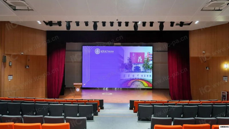 itc根據學校會議、演出等擴聲需求,在報告廳內合理布置多個專業(yè)音箱,精確專業(yè)擴聲系統安裝的角度與方位,經過現場專業(yè)調試,讓舞臺與觀眾席擴聲聲音清晰,聲場均勻、音調音色完美,人聲還原性好,讓每一場活動都精彩紛呈!