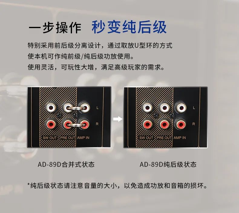 4、前后級(jí)獨(dú)立電路設(shè)計(jì),拔掉U型插銷,可單獨(dú)做純前級(jí)/純后級(jí)使用;