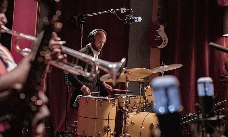 對于這首曲目,我們希望使用UA Sphere建模話筒配合“全Apollo音頻接口”進(jìn)行現(xiàn)場錄音,同時(shí)盡量保持其復(fù)古特色。我們使用了兩臺Apollo x8p接口,總共12路錄制通道,其中10路用于5支 Sphere話筒(每支話筒使用兩個(gè)通道),這使得即使在錄音之后也可以調(diào)整話筒類型、指向性模式和其他話筒特性。